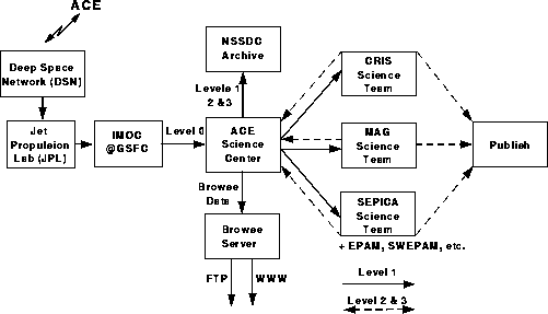 The following diagram serves to outline the flow of the data stream from the ACE spacecraft through the various levels of processing.
